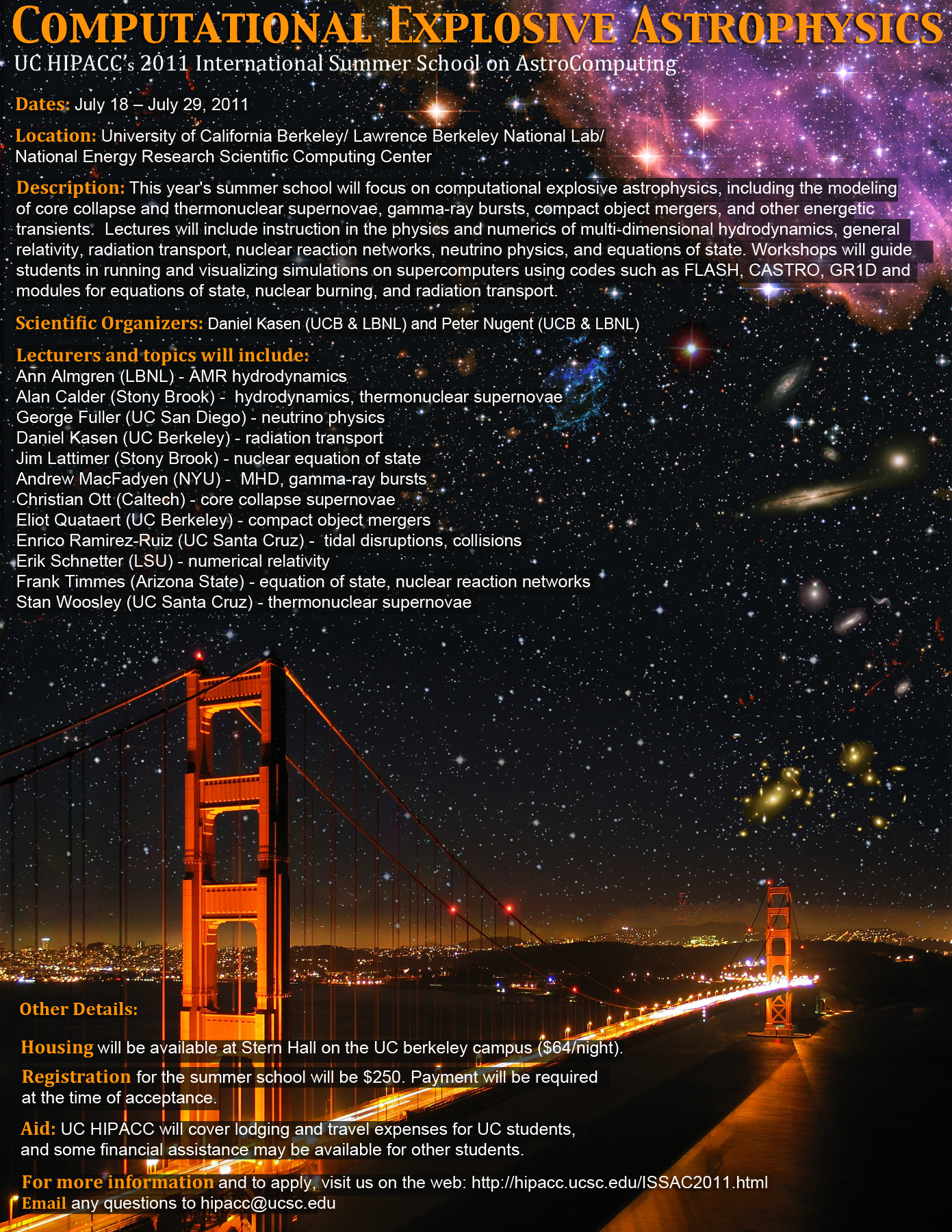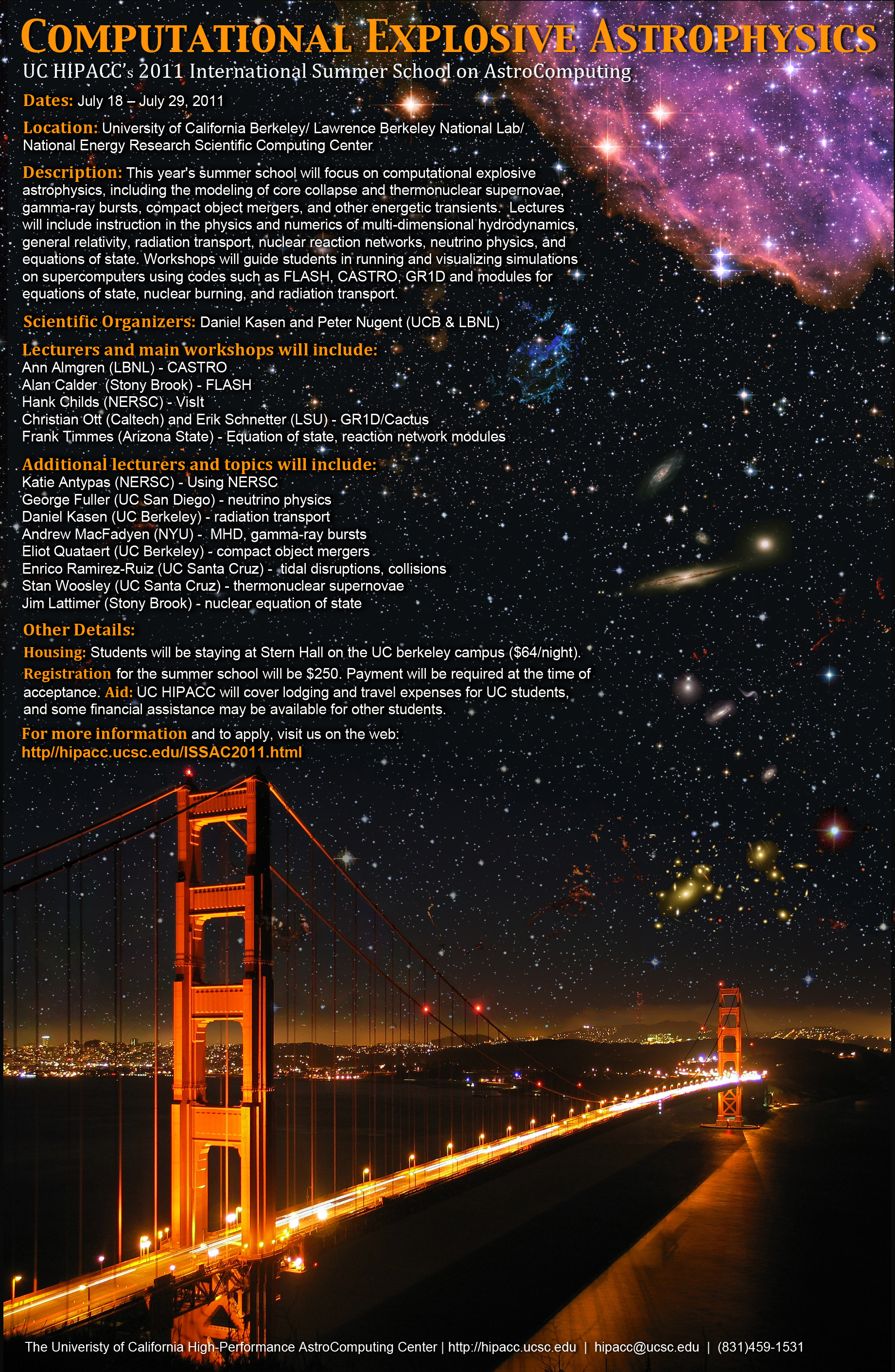 Description: The University of California High-Performance Astro-Computing Center (UC-UC-HIPACC) is pleased to announce the continuation of its international summer school, to be held this year by UC Berkeley and LBNL from July 18-29, 2011. This year's summer school will focus on computational explosive astrophysics, including the modeling of core collapse and thermonuclear supernovae, gamma-ray bursts, neutron star mergers, and other energetic transients. Lectures will include instruction in the physics and numerical modeling of multi-dimensional hydrodynamics, general relativity, radiation transport, nuclear reaction networks, neutrino physics, and equations of state. Afternoon workshops will guide students in running and visualizing simulations on supercomputers using codes such as FLASH, CASTRO, GR1D and modules for nuclear burning and radiation transport. All students will be given accounts and computing time at NERSC and have access to the codes and test problems in order to gain hands on experience running simulations at a leading supercomputing facility.